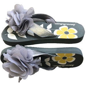 Step into summer with these adorable grey floral thong sandals by Hanna Andersson. The slip-on style with an open toe design makes them perfect for casual occasions and beach outings. The flat heel and rubber outsole provide comfort and durability, while the bow accent adds a touch of whimsy. These size 11 flip flops are perfect for little girls who love flowers and want to stay stylish during the warm months. Don't miss out on these sandals, perfect for any young fashionista!