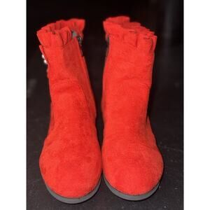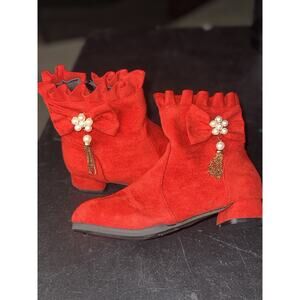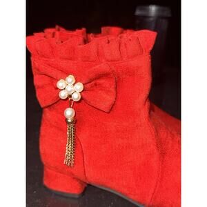 The product is a pair of red boots for little girls in US shoe size 2. These stylish booties are perfect for adding a pop of color to any outfit. Made for girls, they feature a classic boot design with a vibrant red color that is sure to brighten up any ensemble. Perfect for both casual and dressier occasions, these boots are a versatile addition to any little girl's shoe collection.