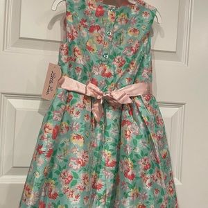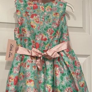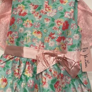 Little girl’s dress with pink lace caplet shawl. Green and pink floral print trimmed with pink satin bow in front, buttons in back with satin pink bow belt, fully lined with built in petticoat, pink lace caplet has single rhinestone button closure in front. NWT