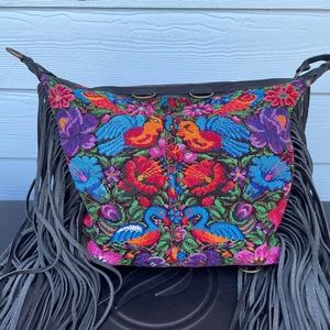 This bag is so pretty in person. It was a custom that I had made. Beautifully embroidered. Both sides of the bag are huipil. It has a 20" shorty strap. Brass hardware. Has backpack option with straps. Crossbody strap. 2 d-rings on front. I have only carried it one time. Leather smells so good