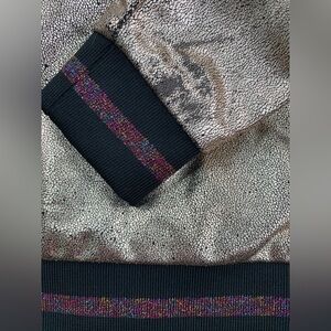 Metallic faux leather jacket with ruffles and cuffed sleeves.