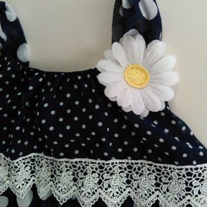 Navy and white Polka Dot dress trimmed with lace at bottom, gathered top ruffle and hem