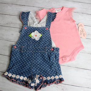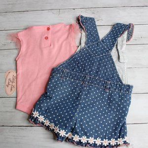 This two piece set includes denim blue jean bib overall shorts with white daisies and a coordinating peachy pink top with mesh cap sleeves. The set is brand new with tags.