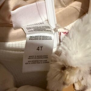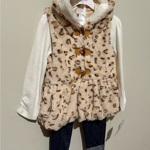 Adorable faux fur vest with animal print. Features toggle buttons. Includes matching long-sleeve top and pants.