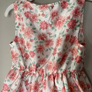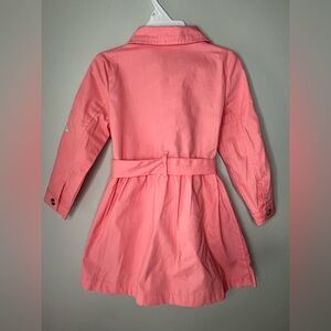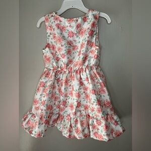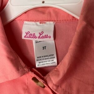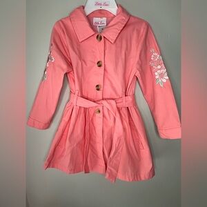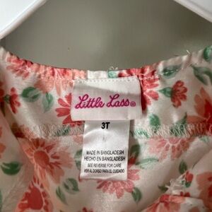 Beautiful Little Lass floral dress with matching jacket. Jacket is a coral color, button closure and has a tie belt. It has embroidered flowers on each sleeve. Matching white dress with coral and green colored floral print. Sleeveless with ruffle bottom. Elastic waist, buttons above the waist are functional, buttons below are decoration. Size 3T