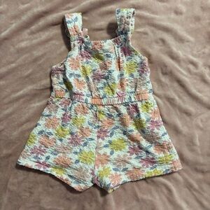 Adorable floral romper by Little Lass. Features textured fabric with pink, purple, and yellow flowers. Button front and knotted straps add charm.