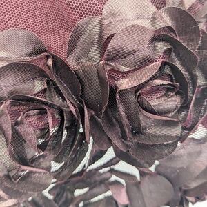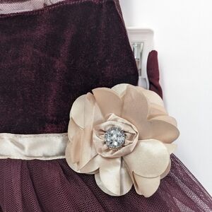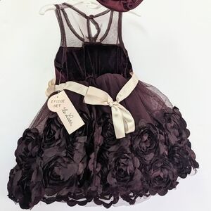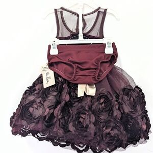 Little Lass girls size 3-6M charming sleeveless purple/plum dress with mesh top upper and velvet top lower for a sweeping contrast, a peek-a-boo button closure in back and layered tulle with a floral design in satin like material and polyester inner lining with matching cover bottoms. Featuring a cream waistband that ties in the back and has a decorative flower accented with a crystal like button.