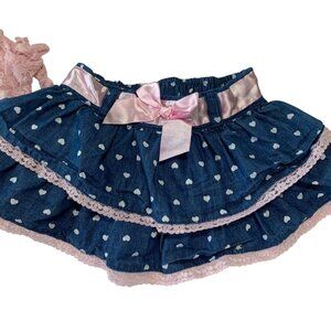 Little Lass Girls Infant Baby Sz 12 Months 2 piece outfit Set Short Sleeve Tshirt Denim Skirt Tiered Bow Tie Waist