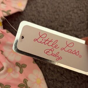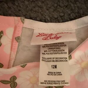 Adorable pink floral baby dress with matching headband. Features cute flower patterns. 12 month
