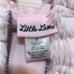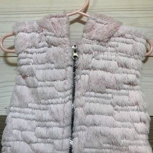 Such an adorable furry pink Little Lass girls vest! Zip front with a hood. Accented with sparkling sequins and little pink satin bows. Excellent condition!