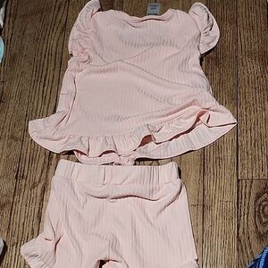 Adorable pink matching set. Features ruffled sleeves and hem. Includes top and shorts with bow detail.