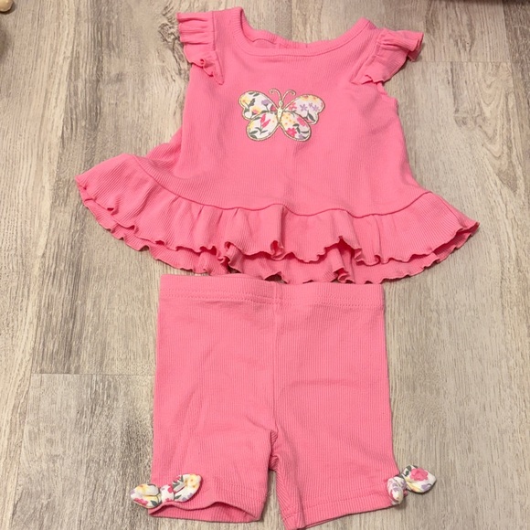 Charming pink shorts set with butterfly detail. Features ruffled top and matching shorts. Ideal for fun outings. In excellent condition