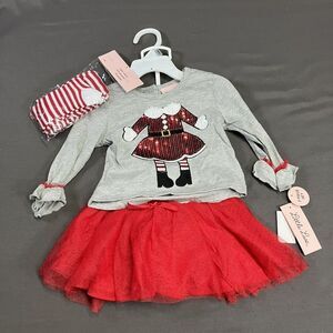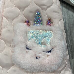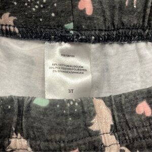 Adorable matching set with a pink quilted vest. Includes a white long-sleeve top. Gray leggings with unicorn print. Perfect for stylish comfort.