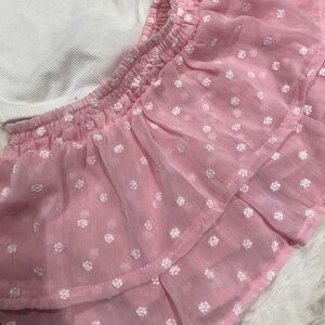 Adorable baby ensemble in pink and white. Features floral embroidery. Perfect for special occasions.