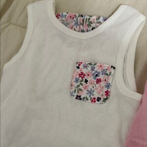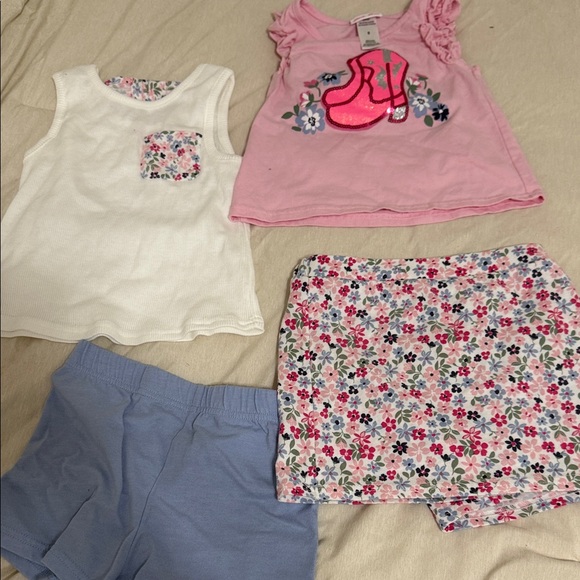 Adorable pink tee featuring a sequin cowboy boots top, floral skort, white floral tank top and blue shorts. Like new condition.