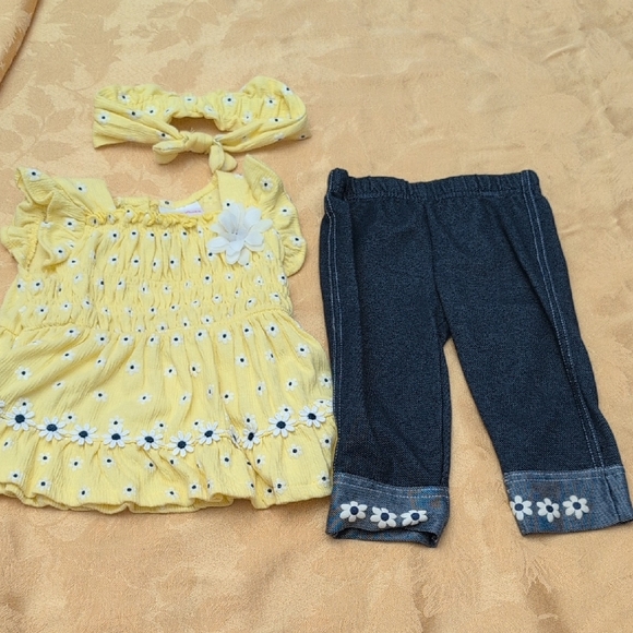 Yellow floral baby outfit with matching headband. Includes a smocked top and dark pants with floral accents.