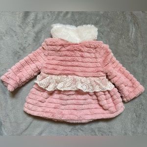 Adorable tiered faux fur jacket with lace details, large buttons and contrast collar! Super soft and lined with silky material! New w|o tags! We never got around to wearing this and now it’s too small for my daughter. This is such a fun and stylish little coat! Elevates any look as it pairs well with dresses, leggings and jeans!