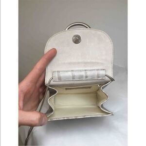 Pale putty leather grey crocodile embossed calf leather lined with ivory twill.