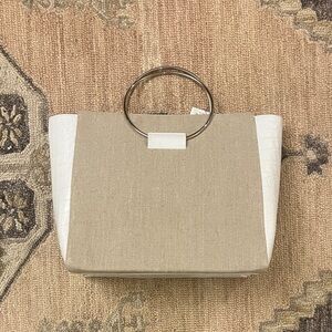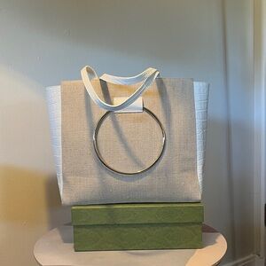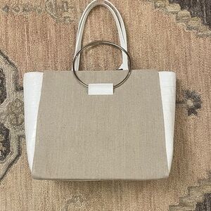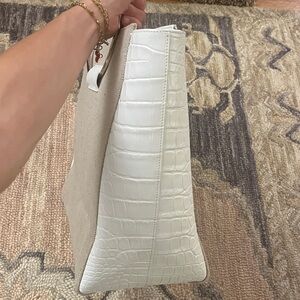 Beautiful and rare art deco inspired signature style tote from little Liffner, made in Italy. Made of a mix of white croc embossed leather and natural canvas. East west silhouette. Large enough to fit laptop and then some. Also great for a travel bag. Convertible between hand carry with the large silver ring handles with rings and shoulder carry. Beautiful and unique art deco inspired bag. Excellent used condition. Authentic.