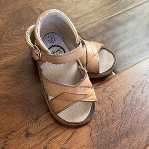 All leather kids sandals in size 7 (14.3 cm).They have a barefoot sole, zero drop, and wide toe box. They have been conditioned and cleaned with CPR leather cleaner.