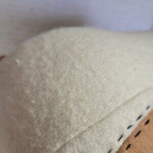 It is super soft, covered in fleece, and almost feels like a little wool!! Not floppy, feels like some foam and cardboard inside.