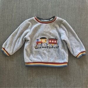Top: ribbed-knit contrast-stripe crewneck; back snap closure; train appliqué and accent embroidery at front; ribbed-knit contrast-stripe cuffs and hem