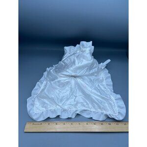 Blanket has no visible flaws, some light creasing on satin trim. Measurements: 14 inches square including trim.