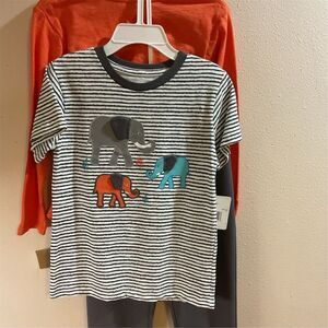 Set includes: Orange long sleeve top, Grey leggings, Striped long sleeve top