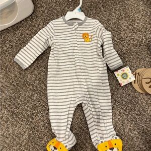 These Little Me footies feature a charming gray and yellow color scheme with cozy horizontal stripes, offering full-body coverage for ultimate comfort. The soft material ensures a snug fit, making it perfect for daywear or sleepwear. Delightful accents add a touch of whimsy to this classic one-piece design.