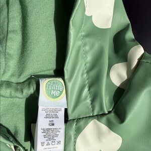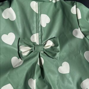 Stylish green jacket with white heart patterns. Features a hood and front zipper. Size 12 months