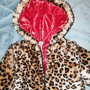 Stylish leopard print pea coat. Soft faux fur material. Cozy hood with red lining. Perfect for keeping warm.