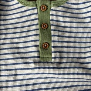 Charming baby outfit with green trim and blue stripes. Soft and cozy fabric.