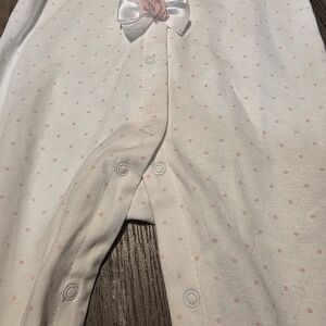 Charming footie with delicate pink bows. Soft and cozy for little ones.