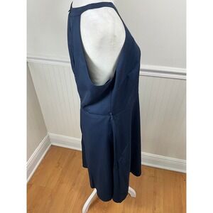 Chic navy blue dress featuring a delightful cascade of embroidered roses. A sleeveless design with a flattering fit and flare silhouette. The dress has a high neckline, a concealed back zipper, and a small keyhole detail at the back. Elegant floral embroidery adds a touch of sophistication to this classic shape. **Note: has belt loops, no belt included.