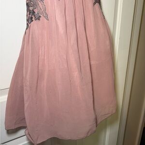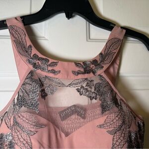 The Little Mistress Mauve Sleeveless Mini Dress in size 6P is a formal and stylish option for petite women. This beautiful dress has gray lace and features a high sheer neckline, stretch back and crinoline underlay making it perfect for parties or cocktails. The pink color and sexy, colorful theme add a touch of love to this short dress, ideal for wearing in the spring, summer, or fall seasons. This dress by Little Mistress combines elegance with a trendy style.