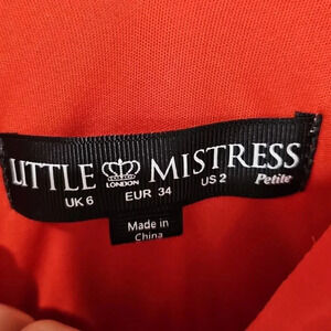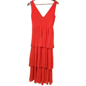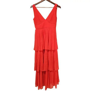 Little Mistress Tiered Maxi Dress in Orange. Size 2 Petite. Features deep V-neck, V-back, sleeveless, empire waist, pleated tiered skirt, hidden side zipper closure, lined, and maxi length. Style L16570L2A. 100% Polyester. Excellent pre-owned condition, no flaws.