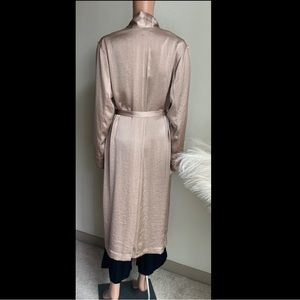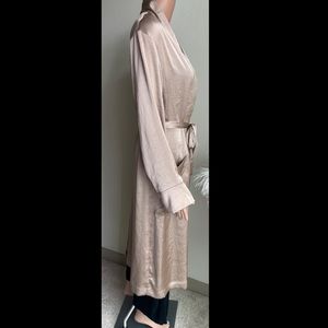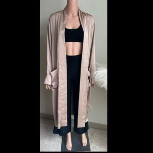 Little Moon tan robe in size small. Made from lightweight glossy satin this robe cardigan has wide kimono sleeves and a matching sash belt - it can be worn open or closed. Worn only once.