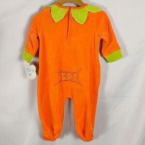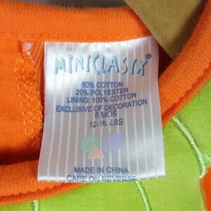 This New with tags orange Mini Clasix "Little Pumpkin" embroidered footsie with matching orange beanie is a size 6 months (12-16 lbs.). 80% cotton 20% polyester and lining 100% cotton and machine washable. All offers welcome.