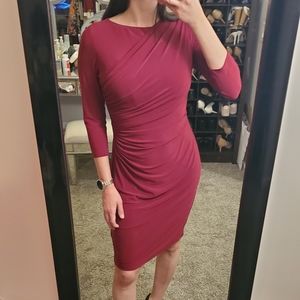 Burgandy jersey dress, flattering silhouette. Could be worn for work or cocktails.