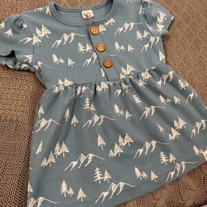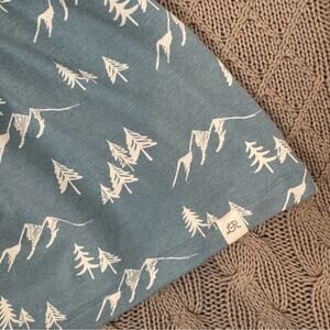 Adorable blue outfit by Little Road Co with mountain and tree pattern. Comes with matching striped pants. Both in great shape.
