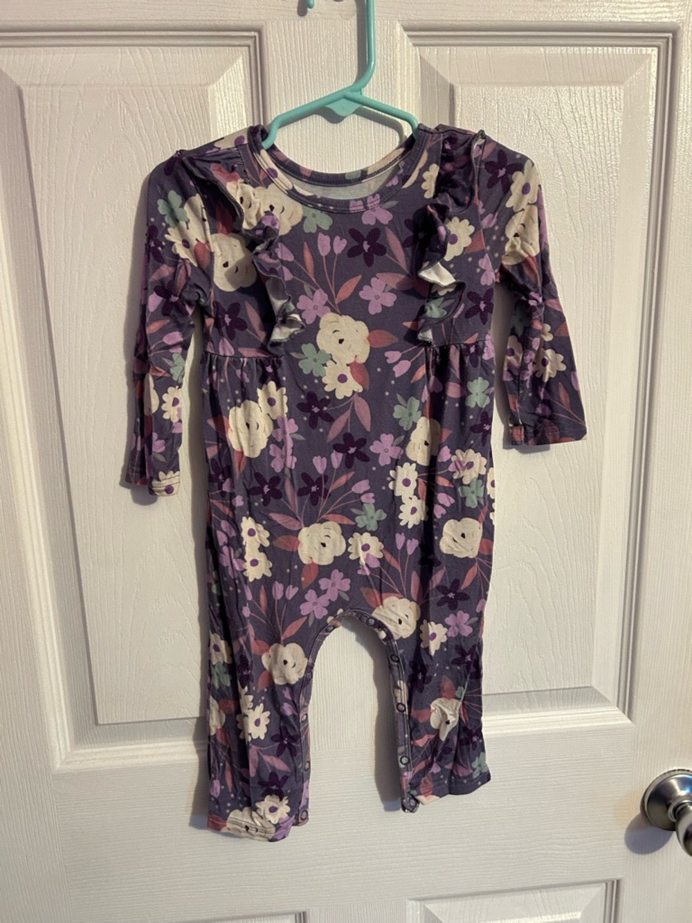 Size 6-12 months. Long sleeves/pants with snaps. Pretty purple floral patten. Slight fading and typical minor wash wear for this fabric and brand. No stains, holes, other defects noted.
