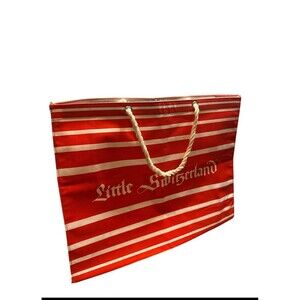 The Little Switzerland Vintage 1980s Red White Stripe Beach Shoulder Bag is a stylish and unique accessory perfect for a beachy or nautical-themed outfit. This medium-sized rectangular bag features a red and white striped exterior with white hardware accents and grommet details. With water-resistant fabric, a glazed finish, and double white handles, this versatile bag is ideal for travel, casual outings, or workwear. Made in Switzerland, this vintage piece adds a touch of tropical charm to any wardrobe, making it a must-have for those who appreciate retro fashion.