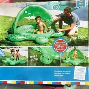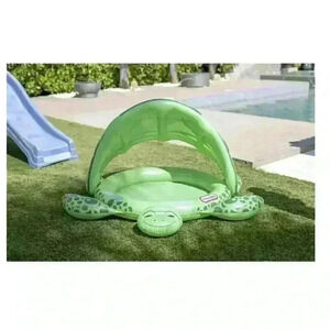 "Welcome to a world of sun-drenched fun with Timmy Turtle! The Little Tikes Timmy Turtle Canopy Pool is a delightful inflatable pool designed for quick setup, ensuring your little ones can dive into their water adventure without delay. The pool inflates rapidly and fills with water just as swiftly, making pool-time a pleasure rather than a chore. And when the day's water escapades are over, the handy drain plug makes emptying and storage a breeze. Children will find endless joy in this safe, shallow pool, designed to provide a refreshing oasis for them to splash and play to their heart's content. And who could resist Timmy's vibrant green hue and charming face? This pool is not just about fun; it's about creating a magical aquatic playground for your little ones. In addition, the pool features a removable sunshade, ensuring that the fun can go on, even in the bright sun. The sunshade provides UPF 50 protection, giving you peace of mind while your children play. With abundant space for water games, your children will adore spending time in this enjoyable pool." Great for both boys and girls ages 2-6 years old.