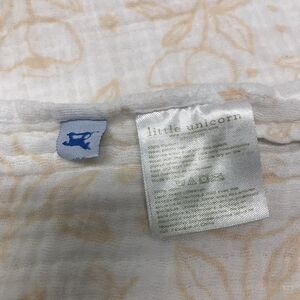 Little Unicorn Floral Muslin Swaddle Baby Blanket. Peach/Orange floral print on white. Preowned in good condition, color has faded a bit from wash and there are some small pulls in the fabric as is typical of muslin (see last picture).