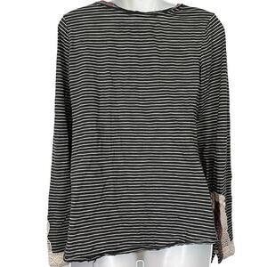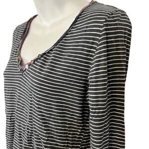 This Little Yellow Button Anthropologie long sleeve top is perfect for casual wear or travel. The V-neck and button accents add a touch of sophistication to the gray striped design. The lightweight polyester and cotton blend fabric make it comfortable to wear in any season, whether it's winter, fall, or spring. The casual sleeve and pullover closure make it easy to wear, while the regular fit ensures a flattering silhouette. This blouse is machine washable, making it easy to care for. The size is medium and the fabric type is knit. This top is not vintage and was made in Vietnam.