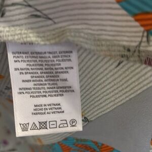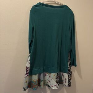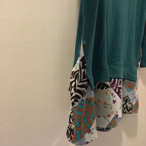 Stylish teal long sleeve top featuring a vibrant patterned hem. Perfect for adding a pop of color to your wardrobe.