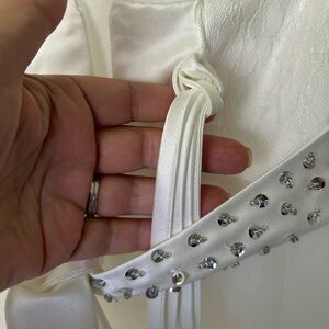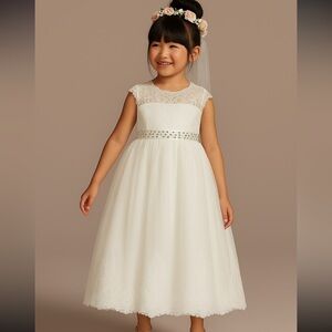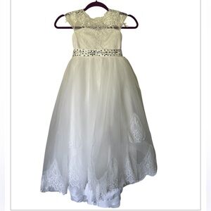 Brand new never worn little girls formal dress. Round neck and cap sleeves. Lace bodice with keyhole back. Satin ties to lace up back. Rhinestone belt. Full skirt has layers of tulle. Crinoline underskirt. Hi low hem. 100% poly. All very soft. Dry clean only. Excellent condition. Brand new never worn. Size 4-5Y