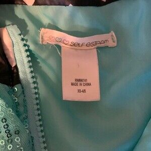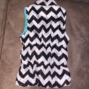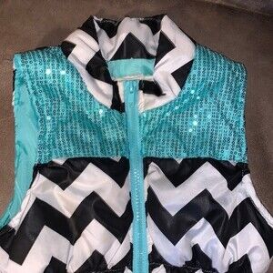 Super cute little girls, puffer vest. Color is turquoise, black, and white. The front has bright, sparkling, turquoise beaded sequins.