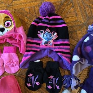 You get a pink sky character hat and glove set from Paw patrol, a vampirina Disney show set, a purple polka dot penguin fleece set ages 4-7, and two Thinsulate thick gloves for playing in the snow. One pair even has the long arm sleeves to make sure no snow sneaks in.