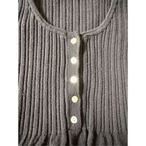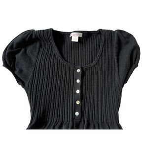 Little Girl’s short sleeve knit dress. “Mother-of Pearl” buttons. Dark navy blue. Scoop neck and cap sleeves. Size S. Measures pit-to-pit:10.5” Length: 26” Cotton,